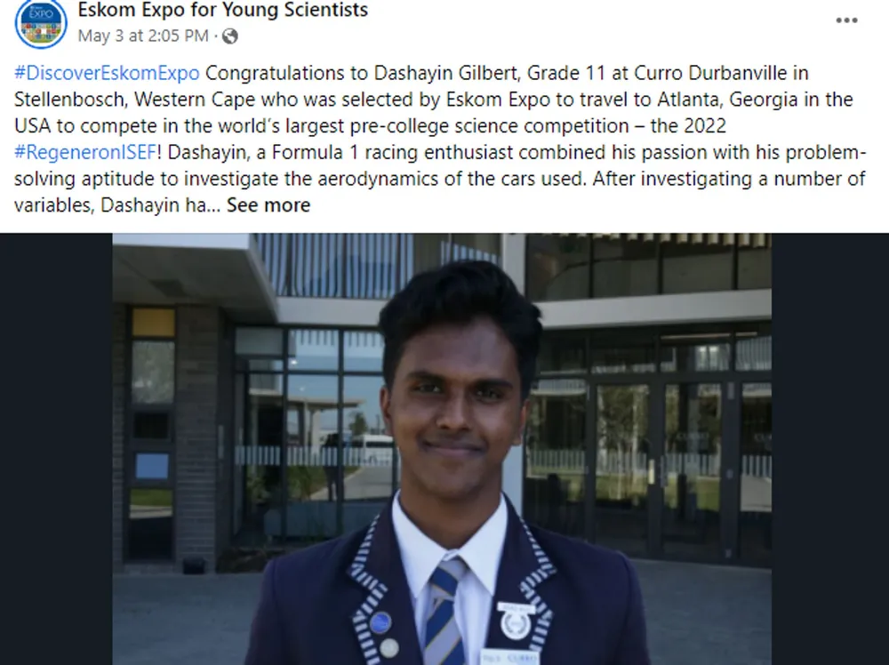 Known as Dash, the 16-year-old Stellenbosch resident won the prize in the physics and astronomy category for his project entitled “Formula One Aerodynamics” at the Regeneration International Science and Engineering Fair in Atlanta.