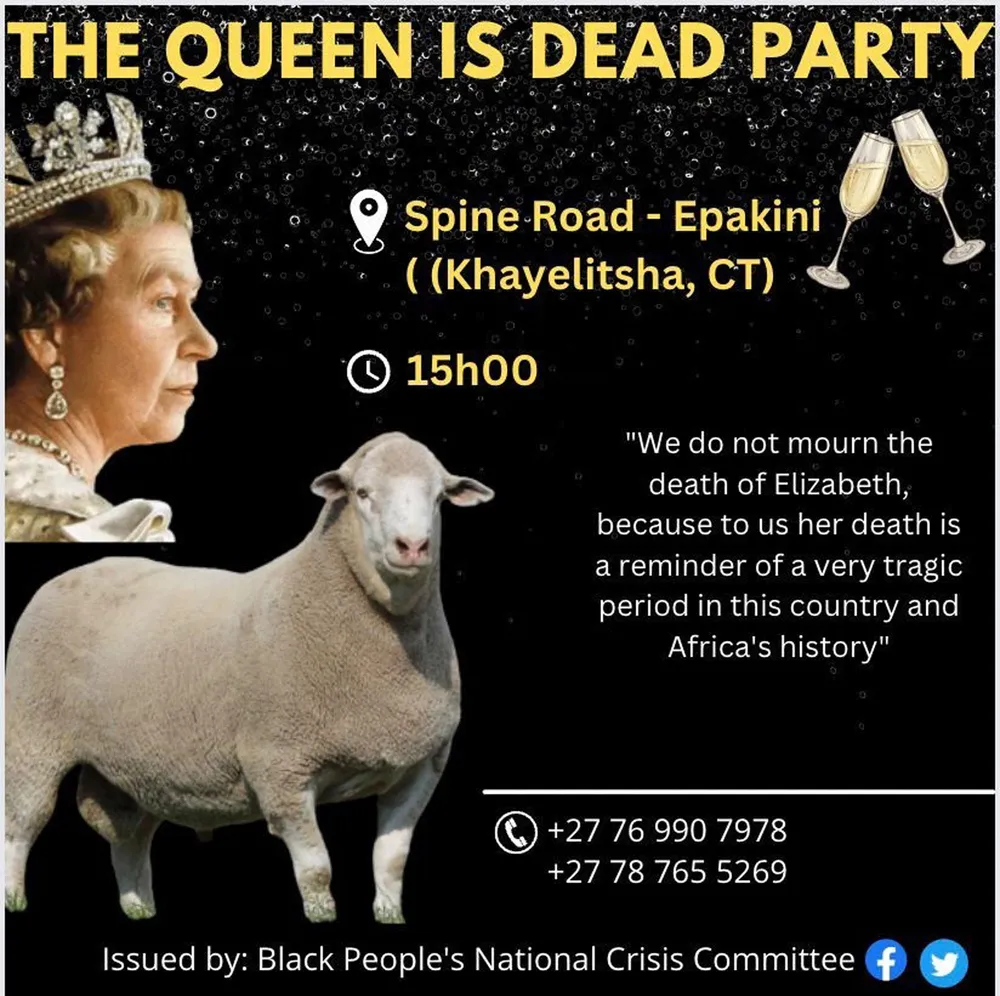 On Monday , while the world focused on the funeral of the matriarch of the United Kingdom, a handful of people were planning a party “to send the monarch to hell” at 3pm outside Kwa Ace Eparkini off Spine Road in Khayelitsha.