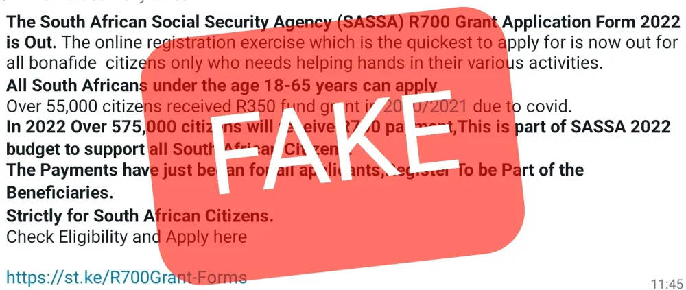 The SA Social Security Agency (Sassa) has warned the public about a fake post that has been circulating on social media claiming that a R700 grant application form for 2022 is out.
