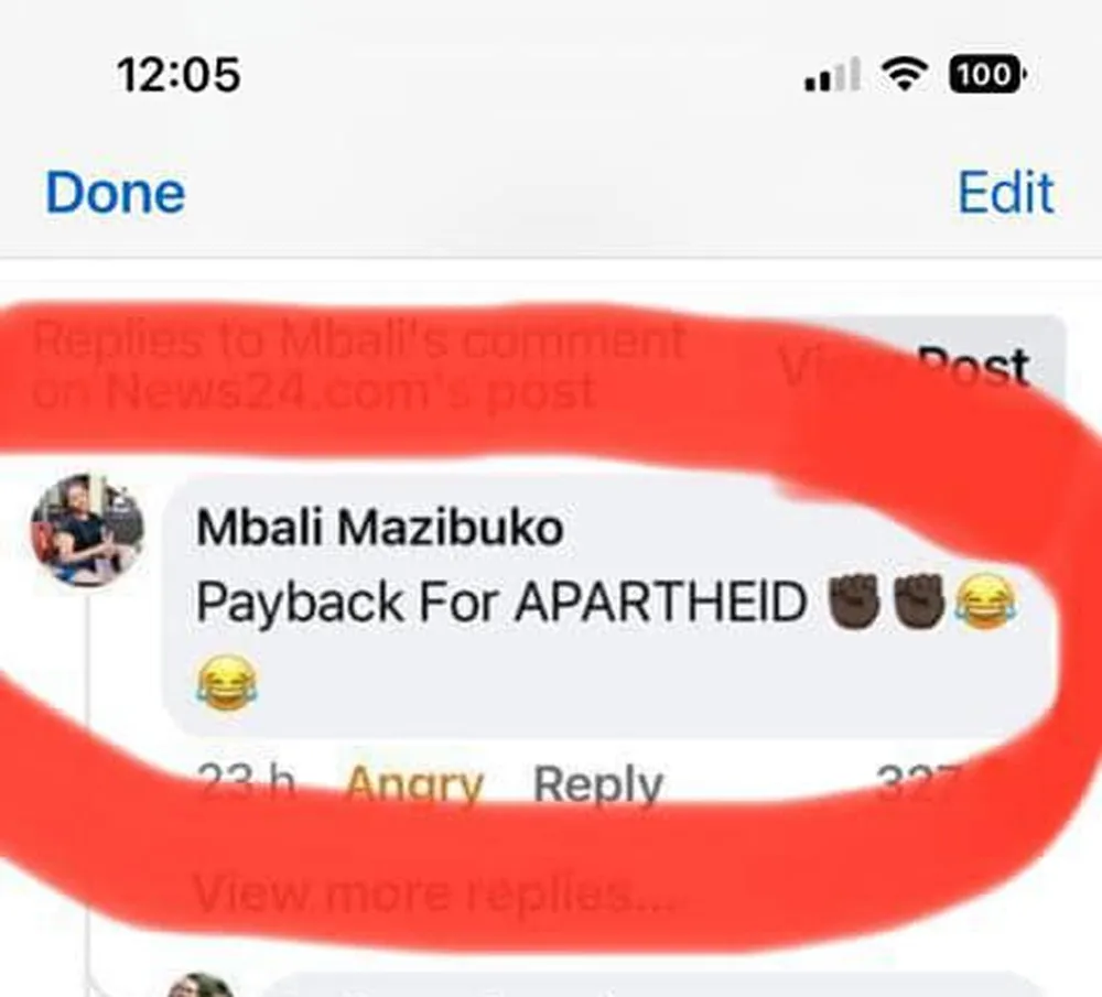 In a Facebook comment on the pair’s death, she said the deaths were “Payback for Apartheid”.