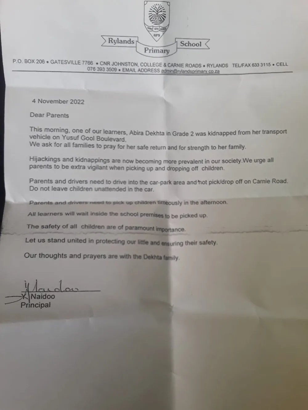 Speaking to IOL, Gatesville Neighbourhood chairperson Fowzia Veerasamy said at the time of the kidnapping, Dehkta and her school transport were awaiting another pupil who lives in Amber Court.