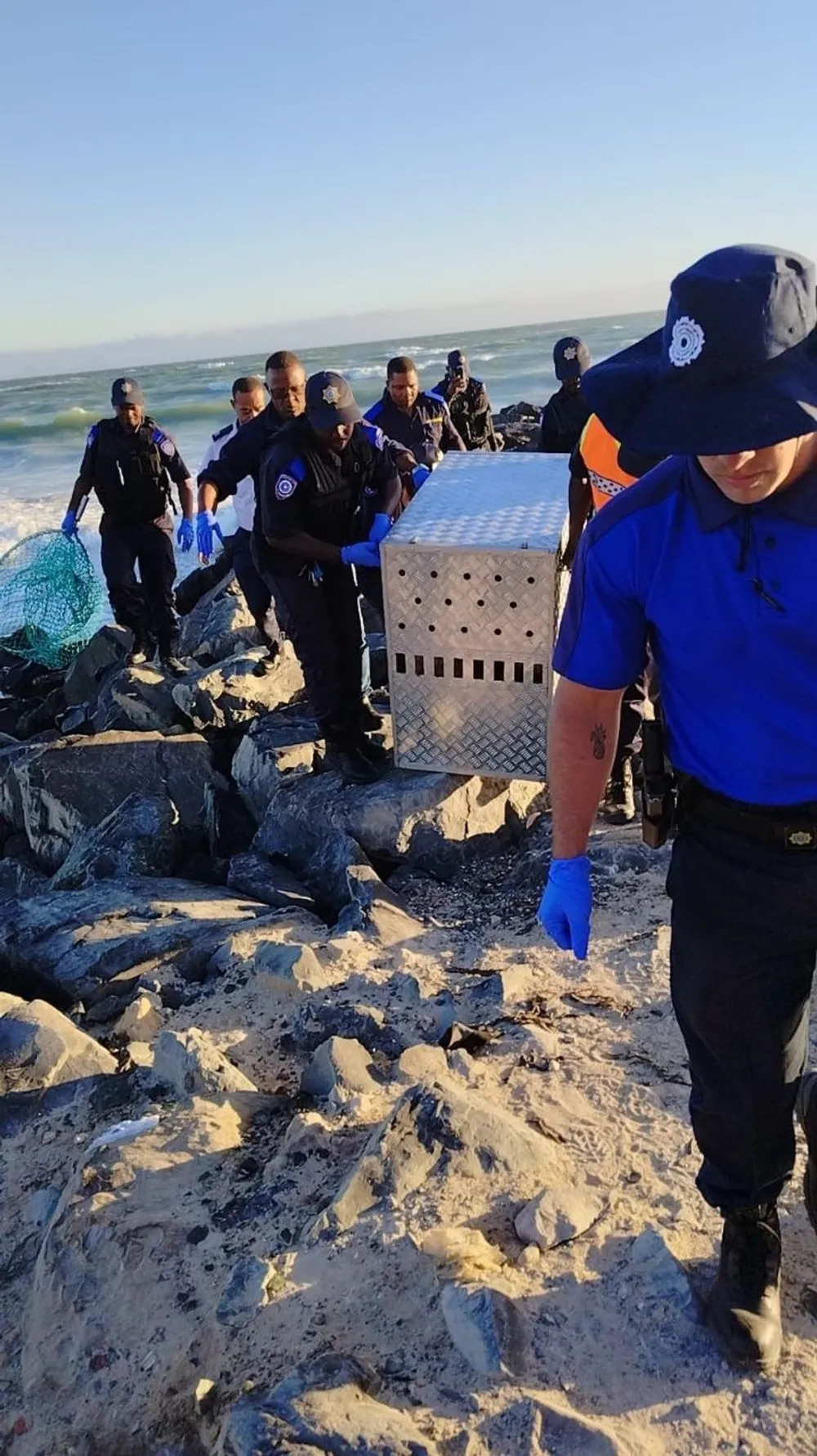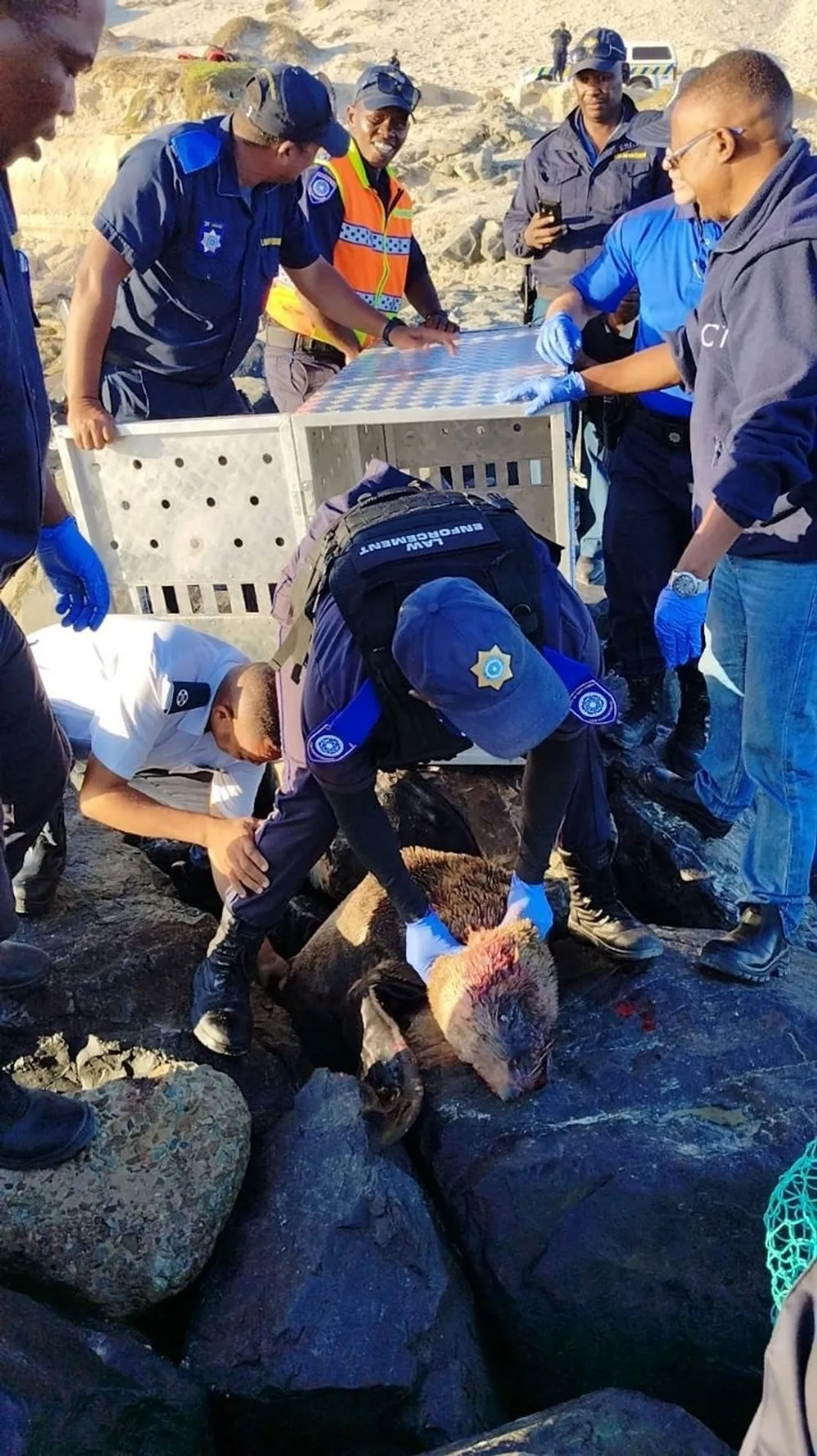 The Cape of Good Hope SPCA revealed that after swift action by Law Enforcement officers, the men were caught trying to kill the seal by throwing moerse rocks at it.