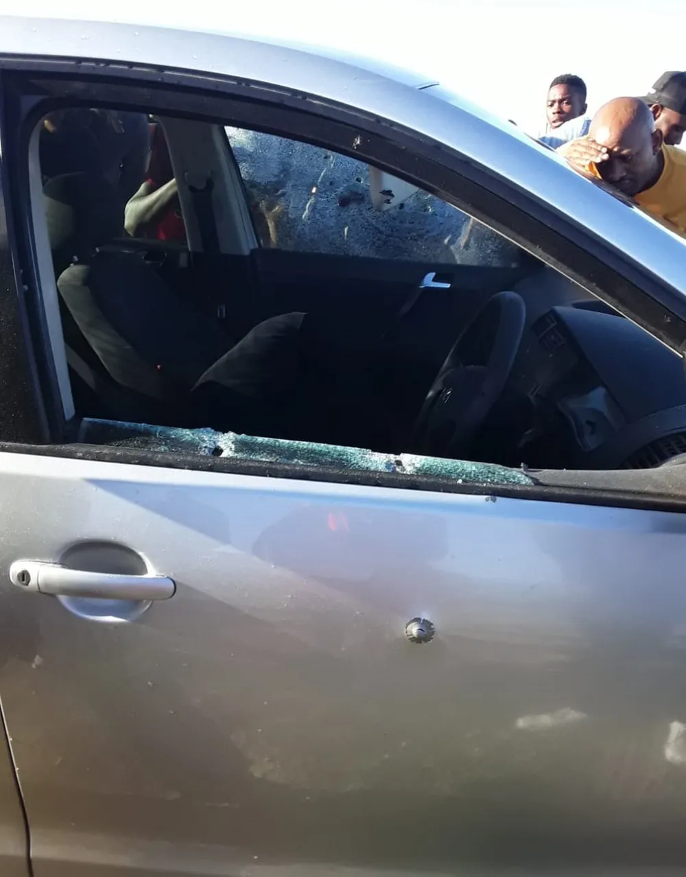 The silver VW Polo sedan was riddled with bullet holes while the driver’s seat was stukkend geskiet.