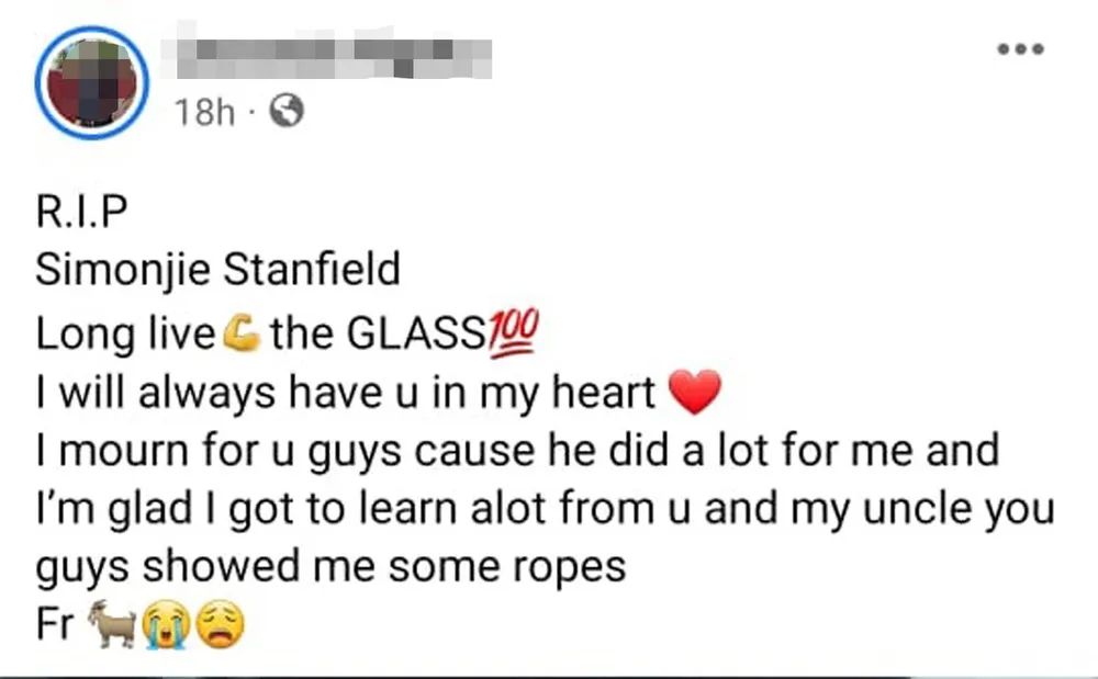 He wrote: “RIP Simonjie Stanfield. Long live the GLASS. I will always have you in my heart.”