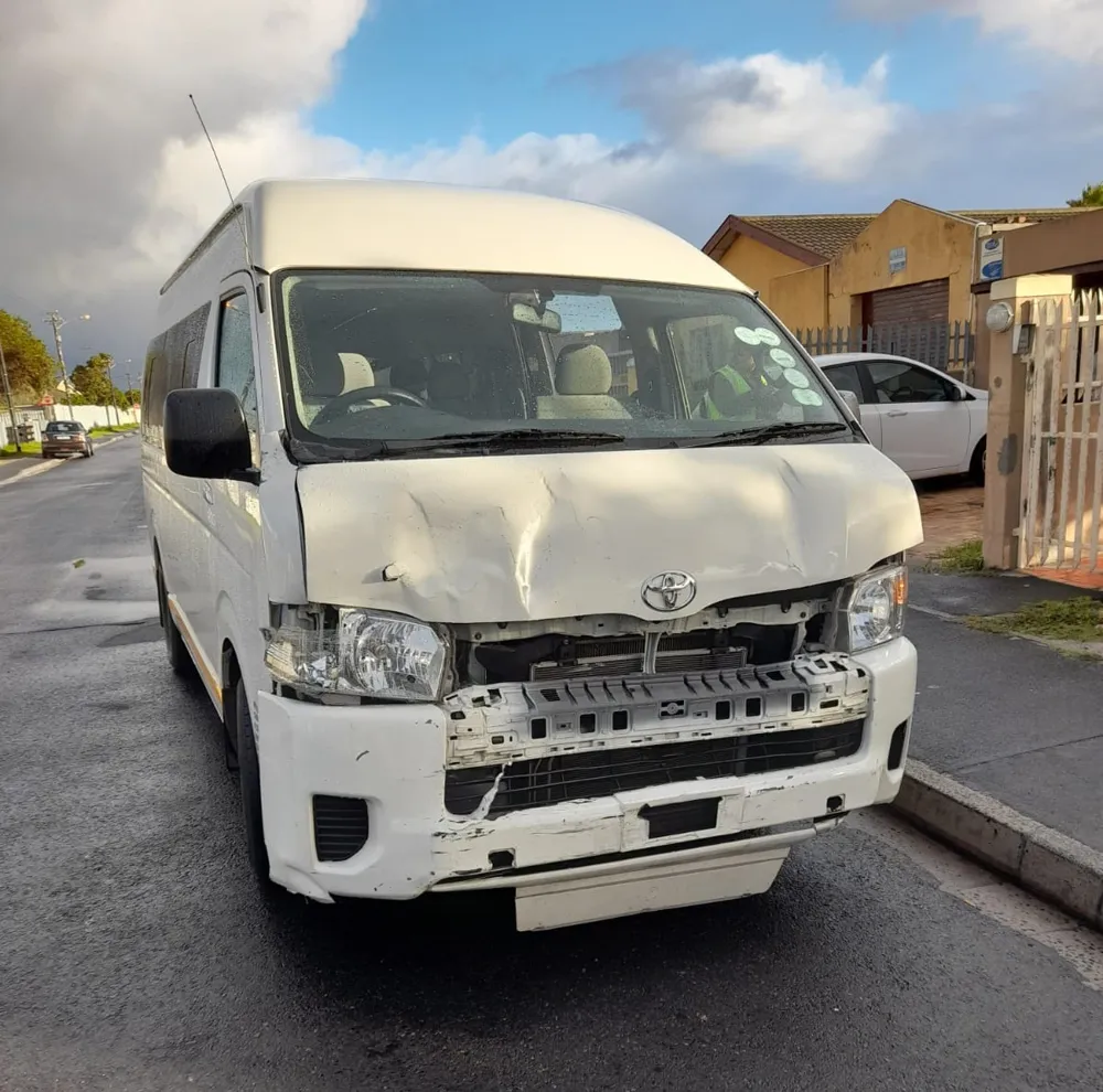 DAMAGE TO THE FRONT: The white Toyota Quantum. Picture supplied