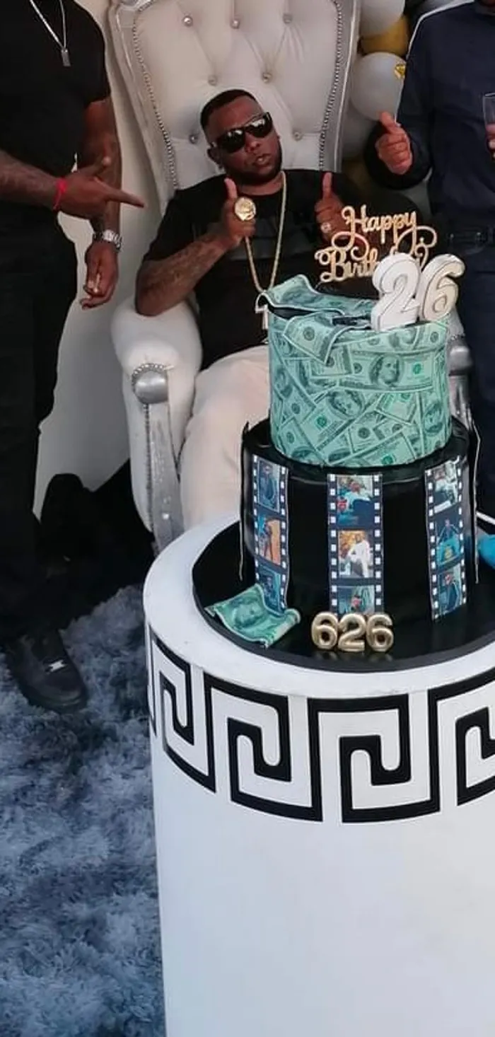 In one picture, presumably at his birthday party, he celebrates it with a cake of American dollars while openly flaunting the prison gang code, “626”.