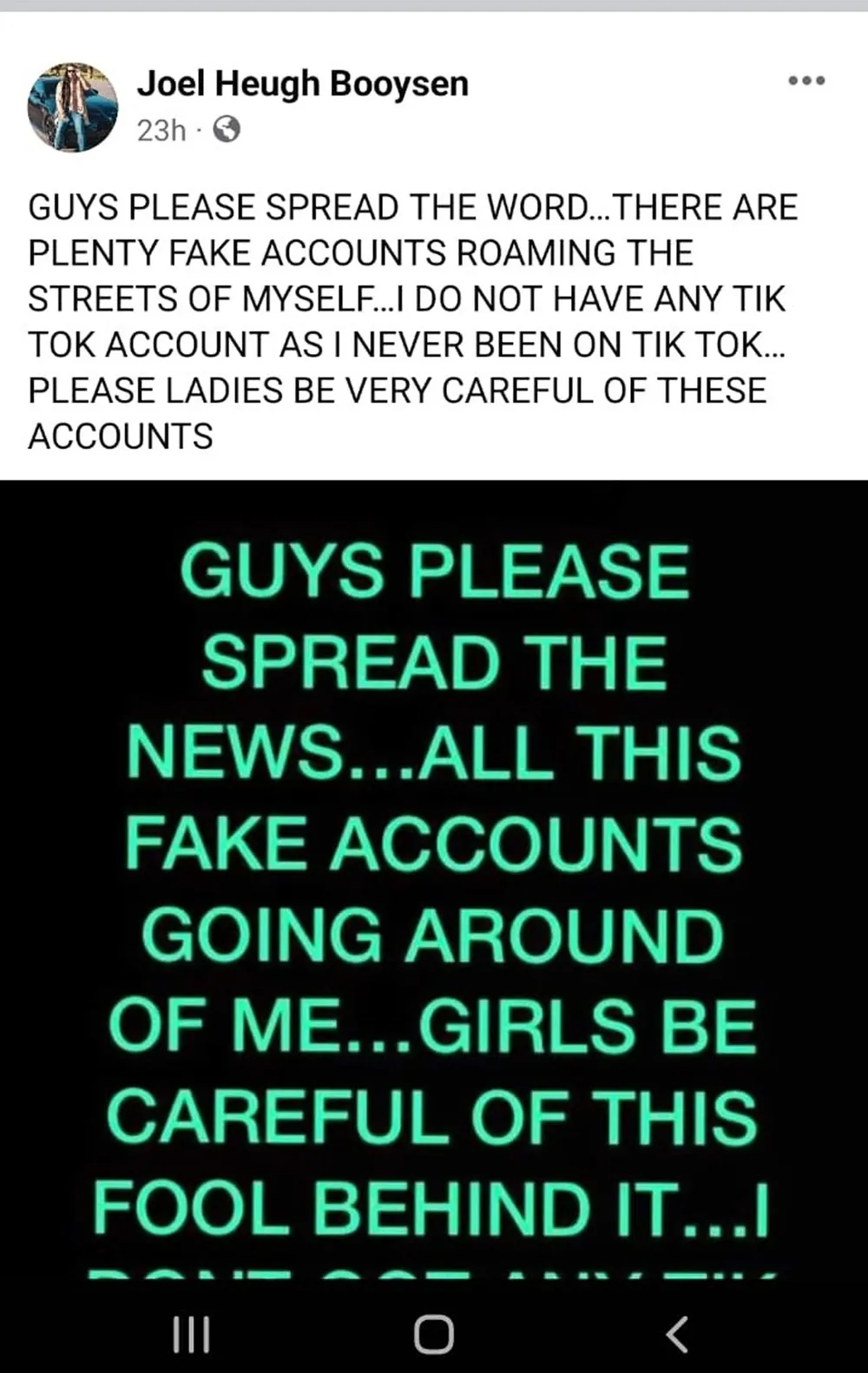 Joel Booysen has warned his female fans to be wakker for scammers creating fake social media accounts to get money from them using his name.