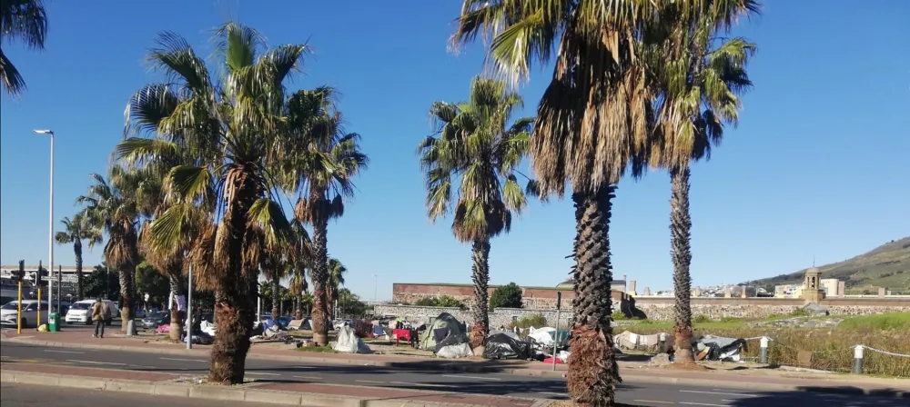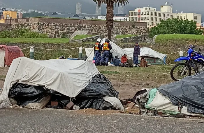 EYESORE: Cops talking to vagrants camped outside the Castle of Good Hope