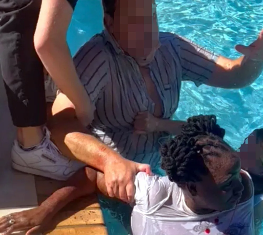 In the video, the bloodied woman is seen being manhandled by a groot man in a swimming pool.