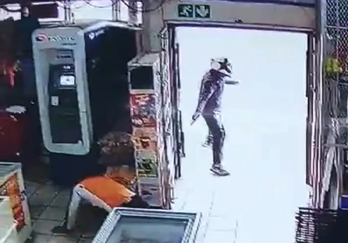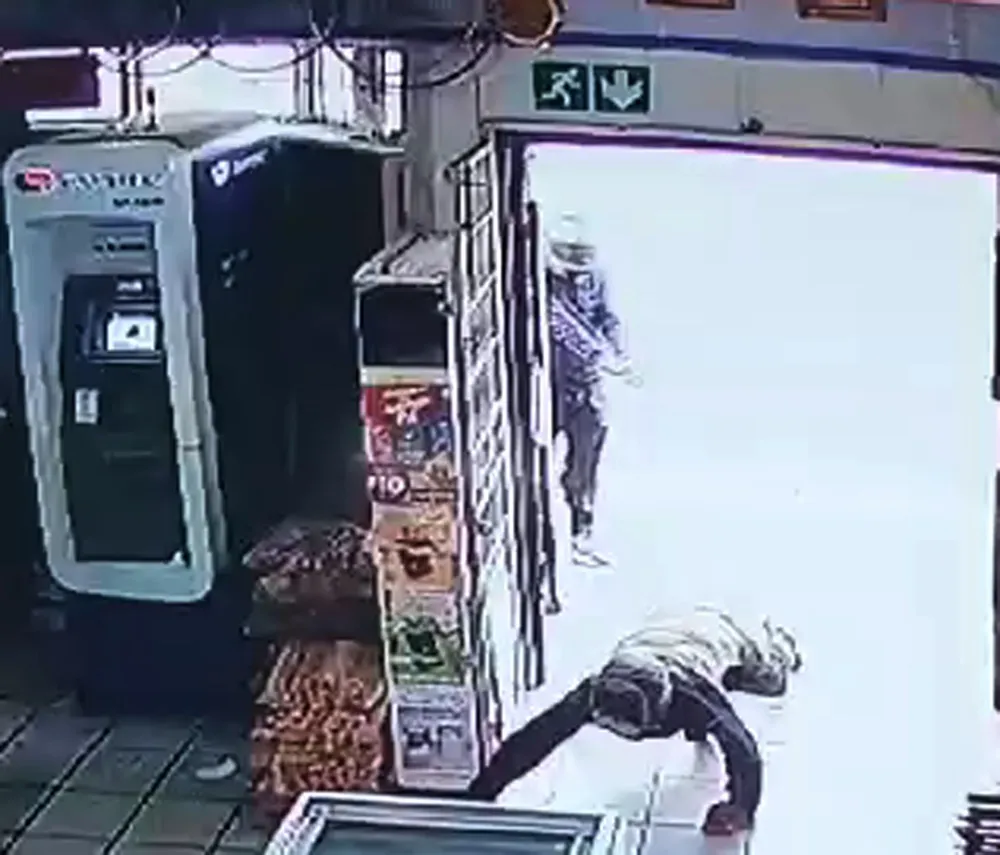 The video, which surfaced on Monday afternoon, shows the alleged gangster running into the shop in an attempt to evade his attacker.