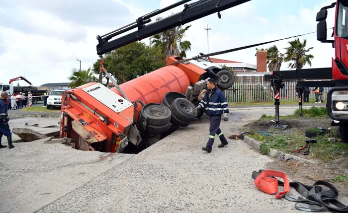 Mense in Lavender Hill got a moerse skrik on Monday when a City of Cape Town vullistrok got stuck in a big sinkhole after the road near Muir Court collapsed.