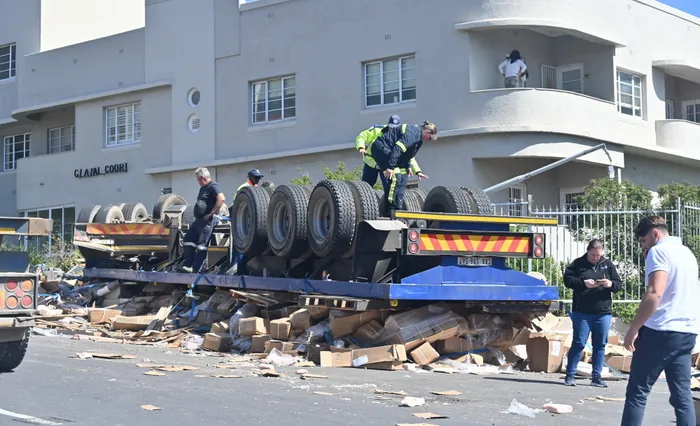 The truck driver from Dibana Logistics in Montague Gardens lost control of the heavy-duty vehicle and crashed into several cars before overturning and landing in the garden of a residential complex.