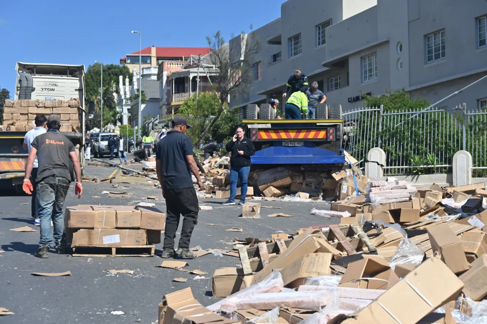 The trok was reportedly carrying boxes of frozen fish mince and kreef. Several emergency service vehicles were on the scene as shocked pedestrians and motorists stood amongst the carnage.