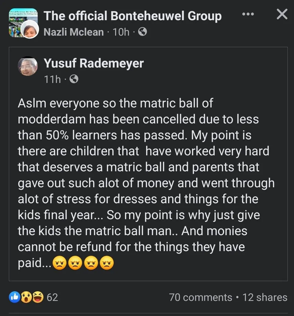 Bronwyn Paulse said: “I do not blame the school for cancelling; school work and studies are much more important. However, for the kids who did well it’s a sticky situation because now they need to suffer as well... Why not give a function to those who passed?”