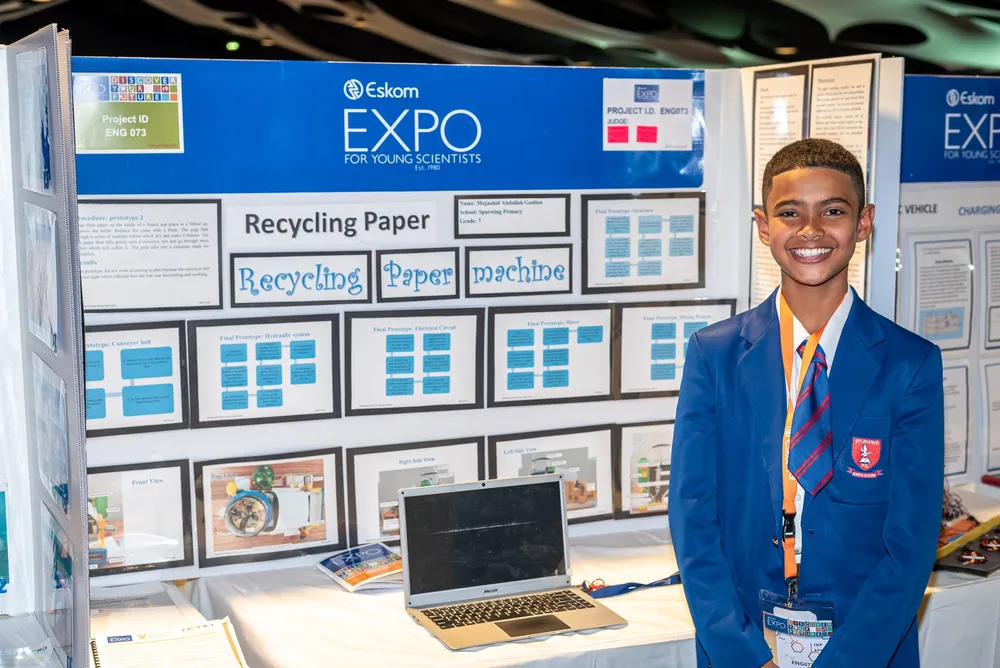 Mujaahid Abdullah Gaidien, 13, from Spurwing Primary School, aimed to save money by producing cost-effective products, preserving trees, and leaving a green footprint for a sustainable future.