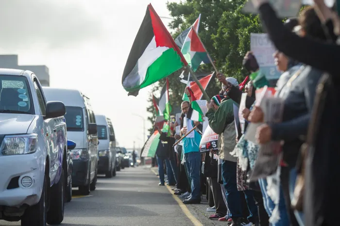 More than 300 health workers gathered outside the Red Cross Children’s Hospital in Cape Town on Tuesday morning’s peak traffic with flags and placards to show support for the children of Palestine. Picture: Armand Hough/Independent Newspapers
