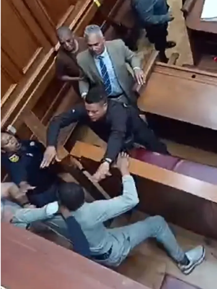 He walks along the passage of the dock towards a cop known as Jamie Scholtz and gives him a smack before he is pulled away by his co-accused and police.