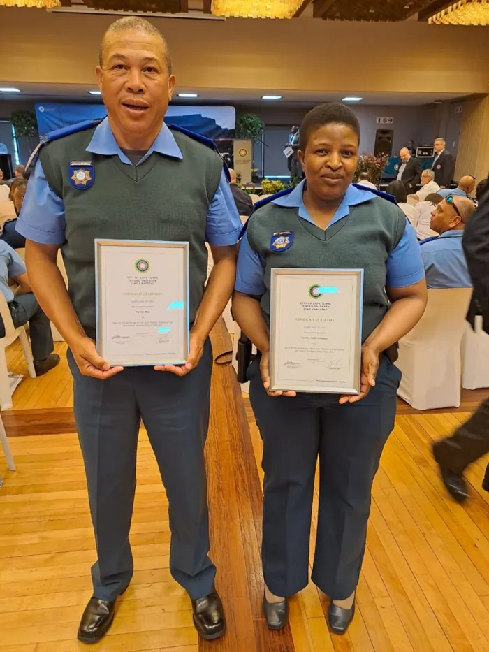 Law Enforcement officers Vernon Elias, 51, and his partner Cynthia Mlanjeni, 39, were honoured for rescuing two siblings, aged 2 and 4, from a burning car in Strand on 27 August.