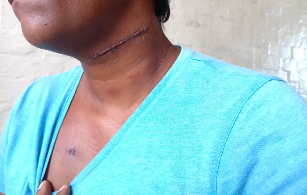The 40-year-old victim, who asked not to be named, was hospitalised after he allegedly grabbed her at a tuck shop and slit her throat with a knife after an argument.