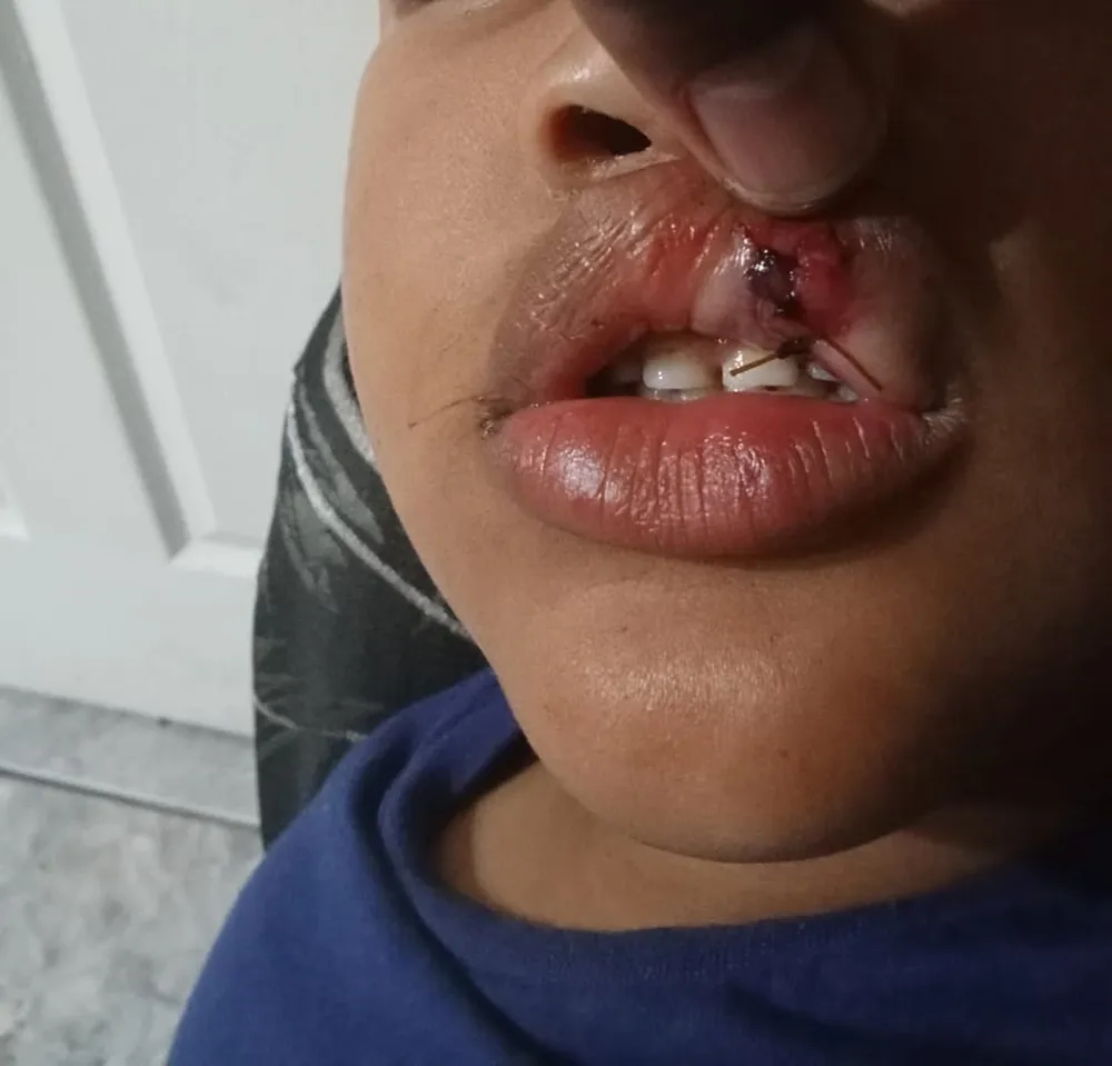 The kleintjie was rushed to the nearby day hospital and the mom says after almost four hours of waiting, doctors stitched his lip back into place.