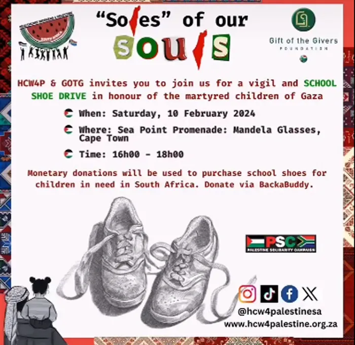 Healthcare Workers 4 Palestine are collecting funds to buy 10 000 pairs of school shoes which will be donated to needy children in South Africa.
