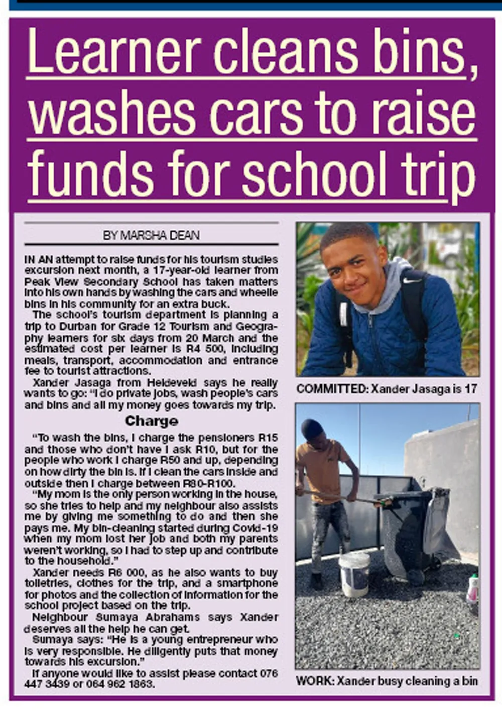 Xander, 17, from Heideveld started washing wheelie bins and cars in his area to save money for an educational trip to Durban.