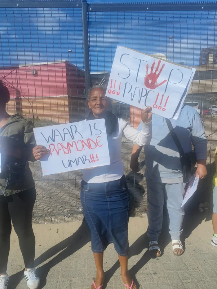 They hoisted placards outside of the Mitchells Plain Magistrates Court yesterday and handed in a petition in a bid to oppose the bail application of Umir Pregnolato of Woodlands.