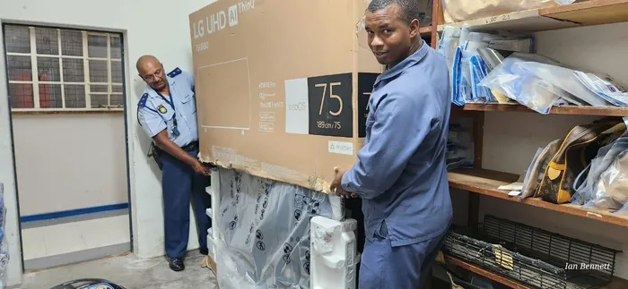 EVIDENCE: Captain Mohamed Riaaz Hassan and Constable Lwandile Saliwa with the pawned TV retrieved in the investigation.