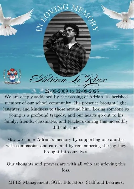 Monument Park High School has shared a touching tribute to Adrian le Roux Monument Park High School has shared a touching tribute to Adrian le Roux
