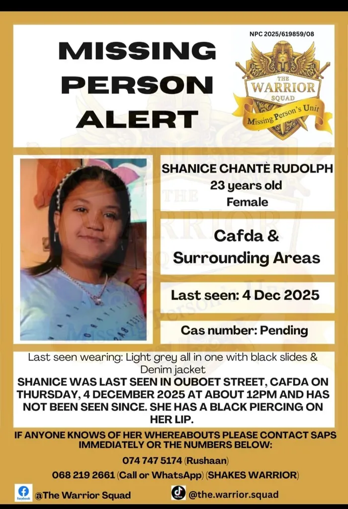 "She was reported as missing on December 5 at Steenberg SAPS. The circumstances surrounding this incident are under investigation. This case will be transferred to Steenberg SAPS for further investigation.