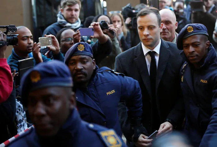 File - Paralympic gold medallist Oscar Pistorius is escorted by police officers as he arrives for his sentencing for the 2013 murder of his girlfriend Reeva Steenkamp, at Pretoria High Court, South Africa July 6, 2016. Siphiwe Sibeko/ Reuters
