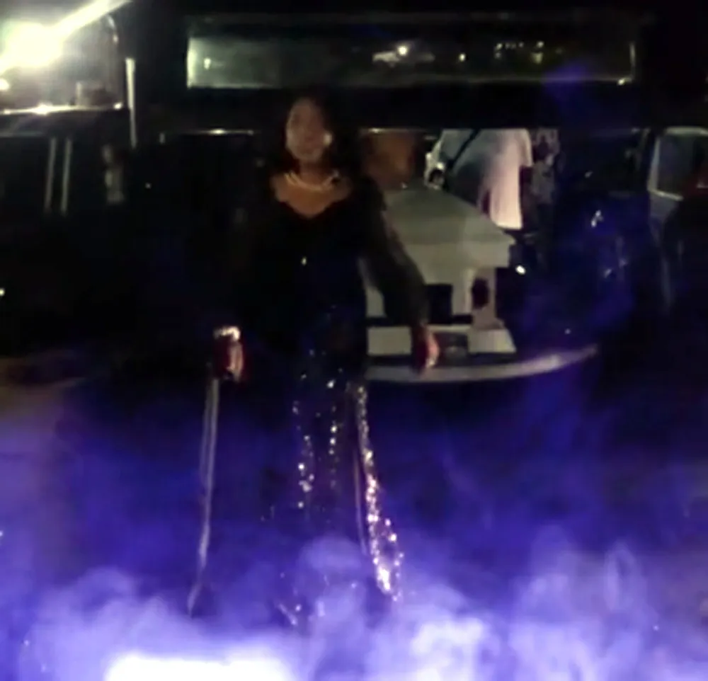 The video that has since gone viral shows the larney stretch limo hearse arriving, and several men taking the casket out of the vehicle.