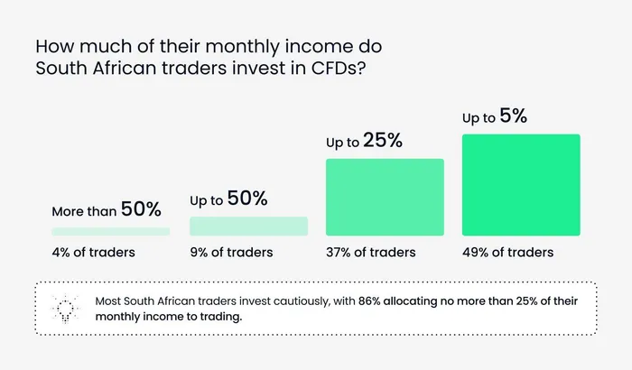The Kantar study also provided insight into how South African traders approach their investments when trading. Despite their commitment, traders are relatively cautious with their funds. Approximately 49% indicated they invest no more than 5% of their monthly income, and 37% stated they would feel comfortable investing up to 25%.