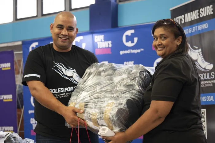 The handover took place yesterday in the school hall and forms part of Andrews’ ‘Soles for Souls’ campaign, an initiative dedicated to providing 42 200 pairs of school shoes to children in need across Cape Town.