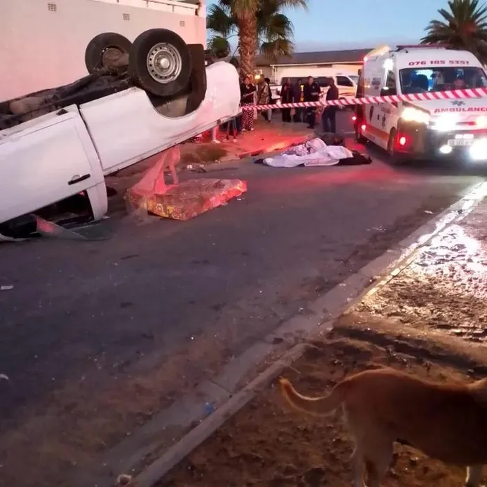 Police and emergency services were on the scene in Hassan Khan Avenue in Gustrouw, Strand yesterday morning when the alleged skelms' white bakkie overturned and was found lying on its roof while members from the community looked on.