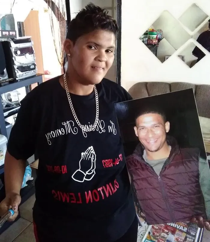 MEMORY: Witbooi seen posing along a photo of her slain brother Clinton Lewis