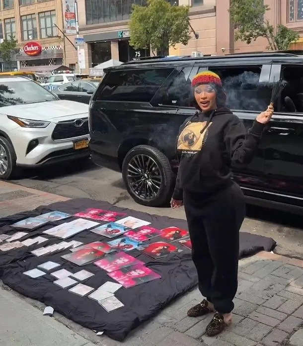 Cardi B set up shop on a Manhattan sidewalk, laying out copies of her album on a black sheet like a street vendor.