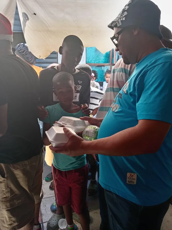 LOCAL HERO: Lotus River's Rudy Roman handing out food parcels to children.