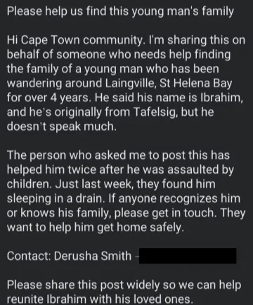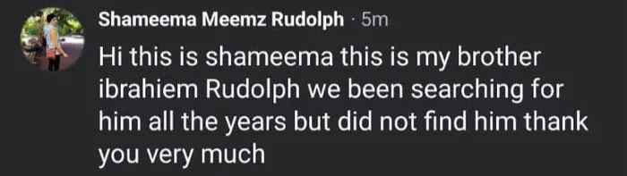 The sister saw the post and commented: “Hi, this is Shameema. This is my brother Ebrahiem Rudolph, we [have] been searching for him all the years but did not find him, thank you very much."