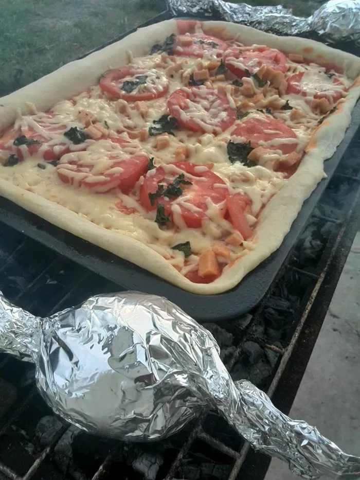 As you all know, when we braai there is a period where we have to wait for the coals to reach the perfect temperature before we can braai our meat. Well, what I do is when the coals are that hot, I make pizza. I place my tray with my pizza on top of the braai until the base bakes golden brown, then I place it in a very hot oven on the grill to finish it off. Tastes amazing. So while we wait for the meat, we can nibble on delicious cheesy pizza.