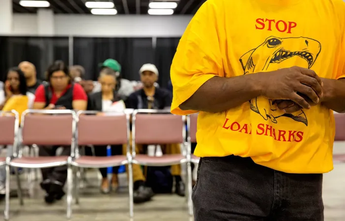 THE message ‘Stop Loan Sharks’ is written on a T-shirt worn by an associate with the Neighbourhood Association Corporation of America. The writer says loan sharks often operate beyond the reach of regulators and the legal system. David Goldman AP