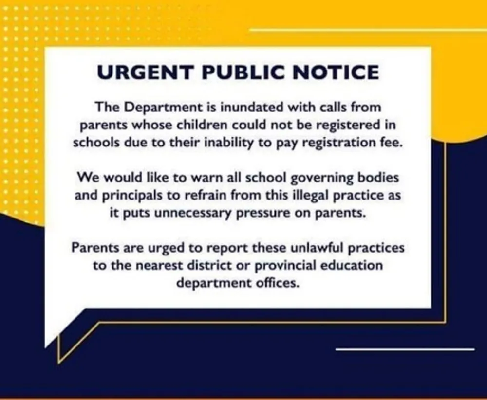 However, the Department of Basic Education has confirmed that it is illegal for schools to demand a registration fee from parents as a prerequisite.