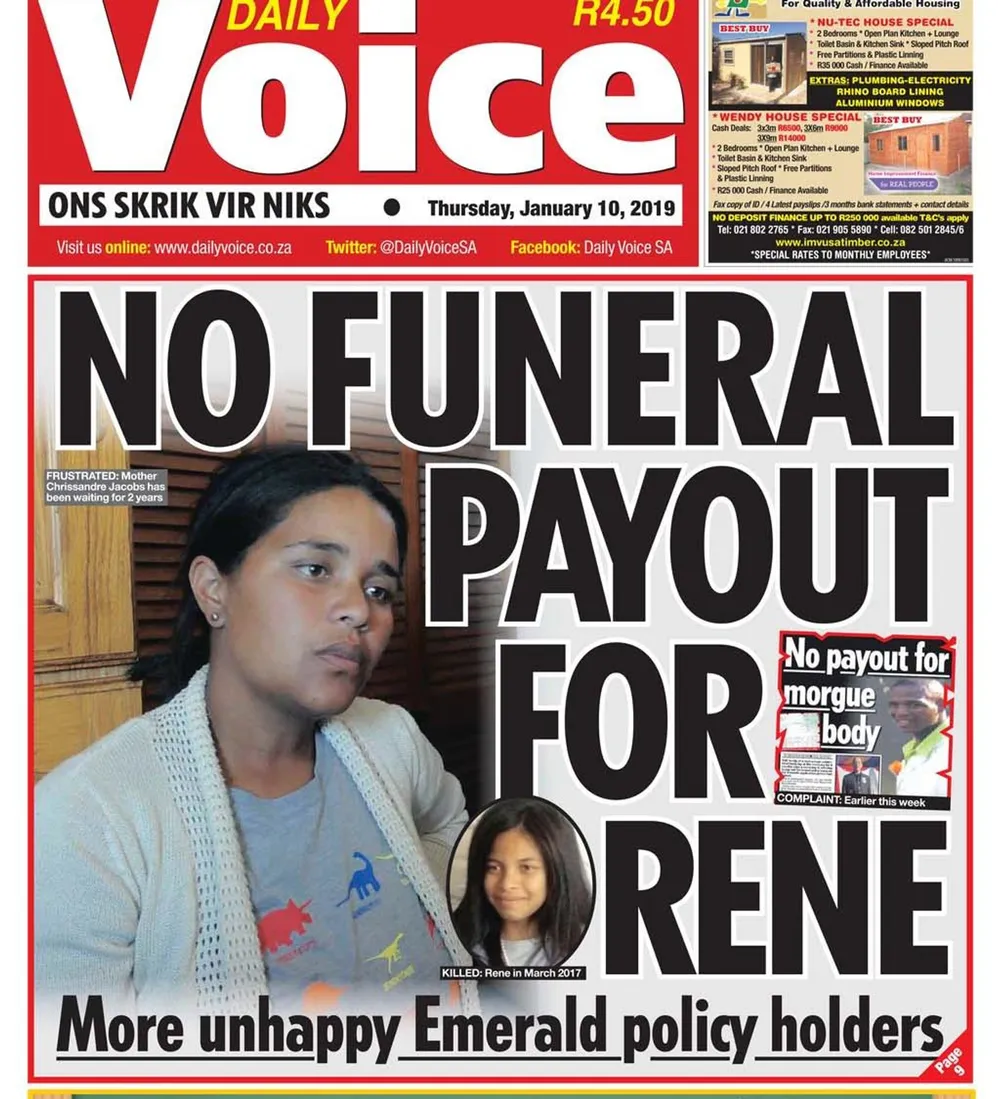 This week, the Daily Voice published the stories of two families who have not received funeral payouts, after taking out policies with Emerald Life, Funeral Insurance and Wealth Creator.