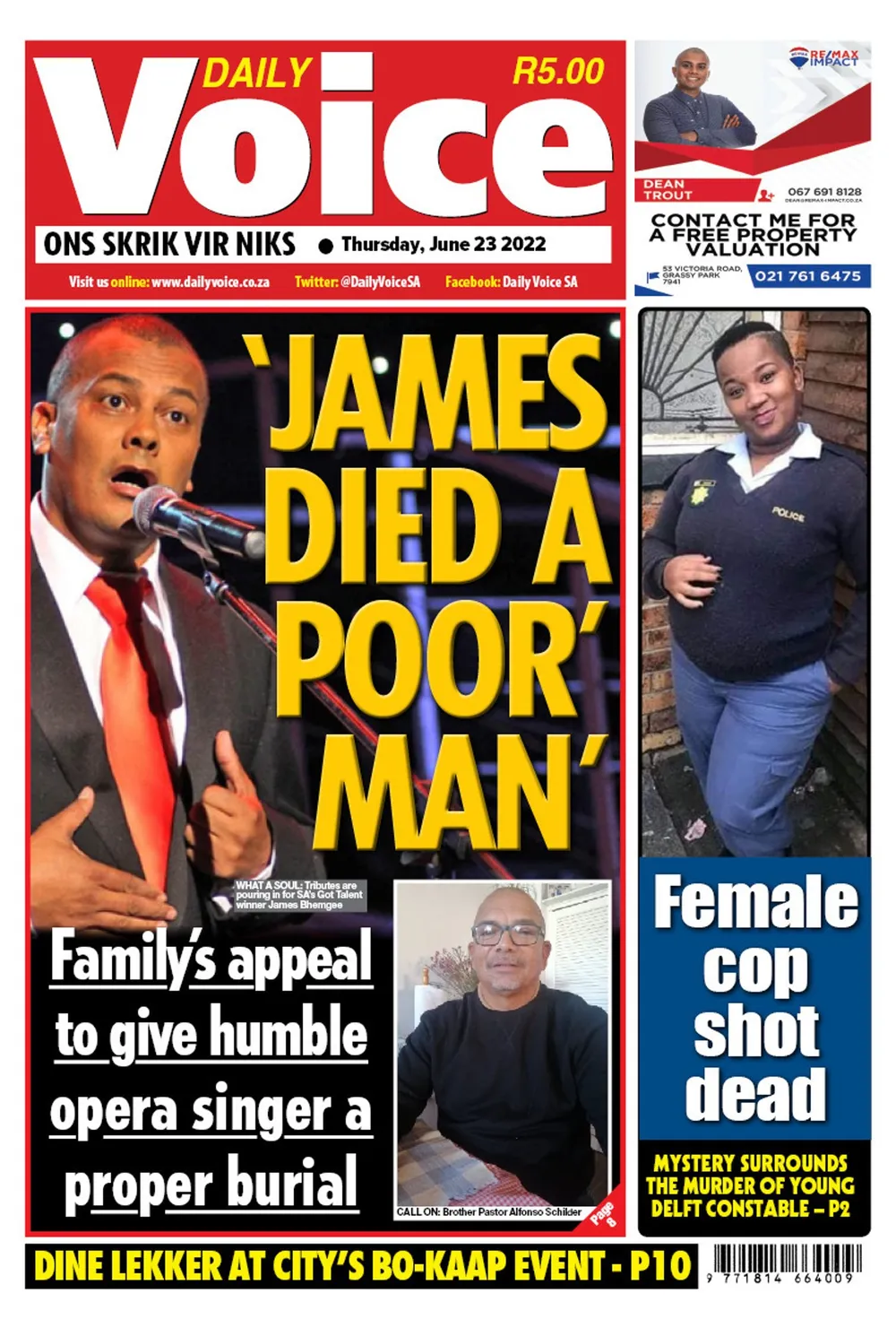 The Daily Voice ran a front page about the death of popular local opera singer, James Bhemgee, headlined “James died a poor man”.