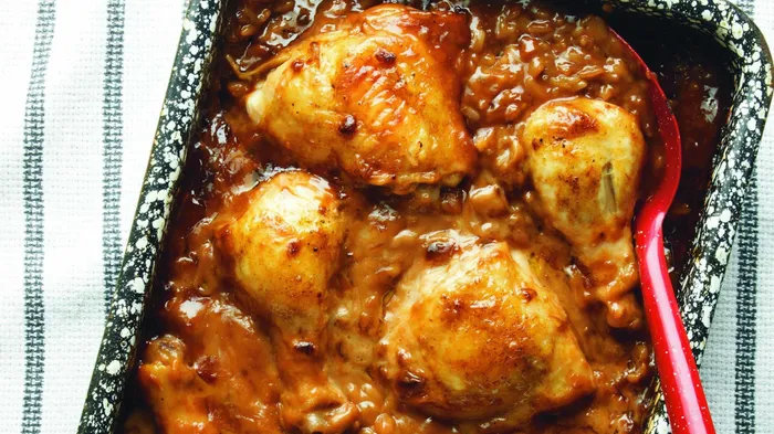 Bake, covered, for 1 hour before removing the tinfoil and baking for another 20–30 minutes, until the chicken and rice is cooked through and caramelised.