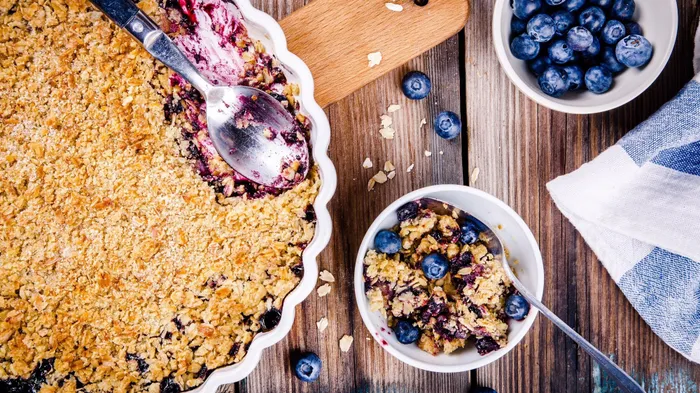 Arrange 1 cup blueberries and 1 cup chopped apple in the bottom of the prepared baking dish.