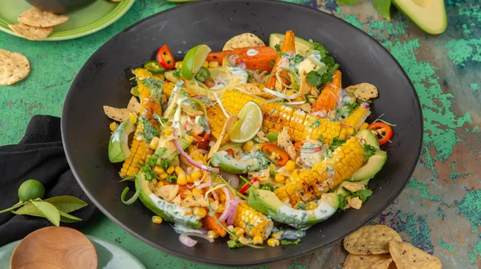 To serve: Arrange the corn, sweet potato, avocado slices and onion on a platter.