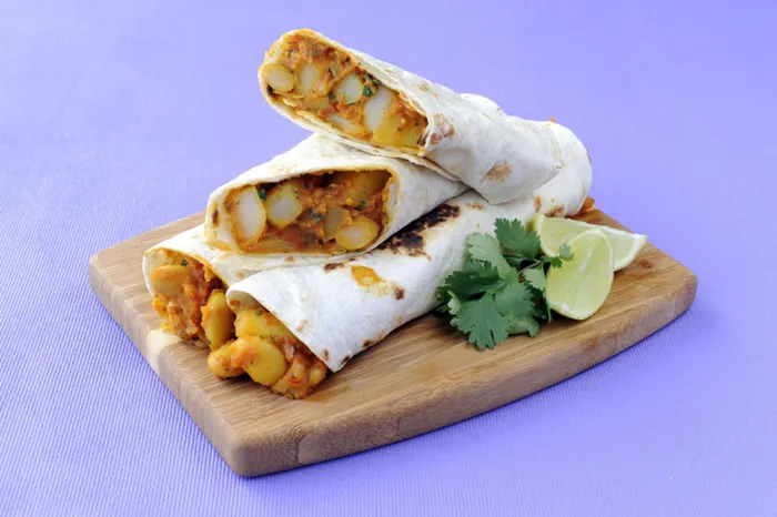 The potatoes should be soft and the curry a thick consistency. Stir in the coriander and serve rolled in a warmed roti or wrap.
