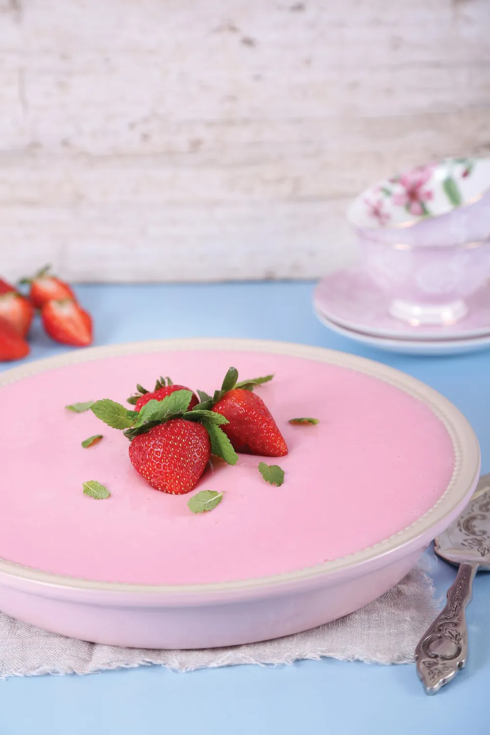Pour gently onto the strawberry mixture. Decorate the top of the tart with the halved strawberries and let the tart set for 3 hours in the fridge.