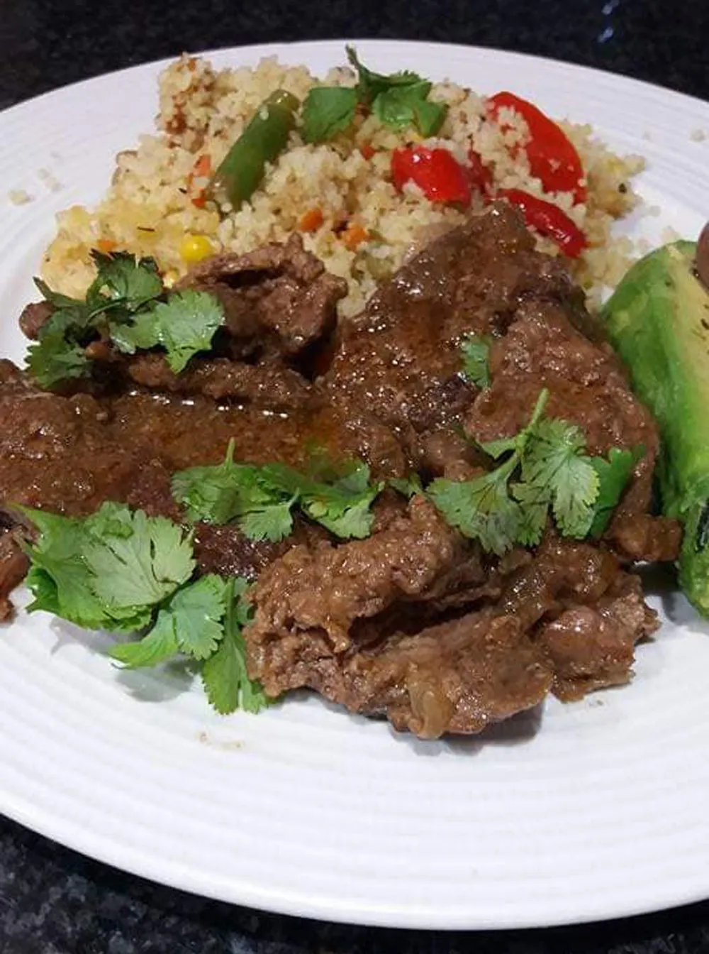 Feriel Sonday’s braised tenderised steak with veggies couscous and avo salad